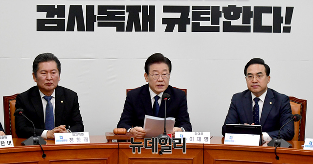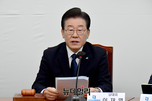 이재명 더불어민주당 대표가 27일 오전 국회에서 열린 최고위원회의에서 모두발언을 하고 있다.