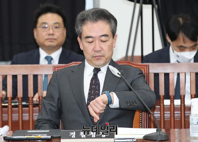 윤희근 경찰청장이 27일 오전 국회에서 열린 정보위원회 전체회의에 출석해 있다. (공동취재사진)