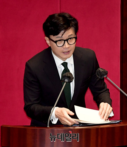 한동훈 법무부 장관이 27일 오후 국회에서 열린 본회의에서 이재명 더불어민주당 대표 체포동의요청 이유설명을 하고 있다.