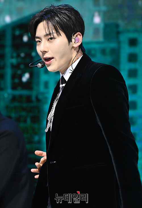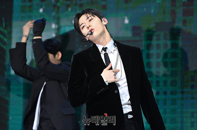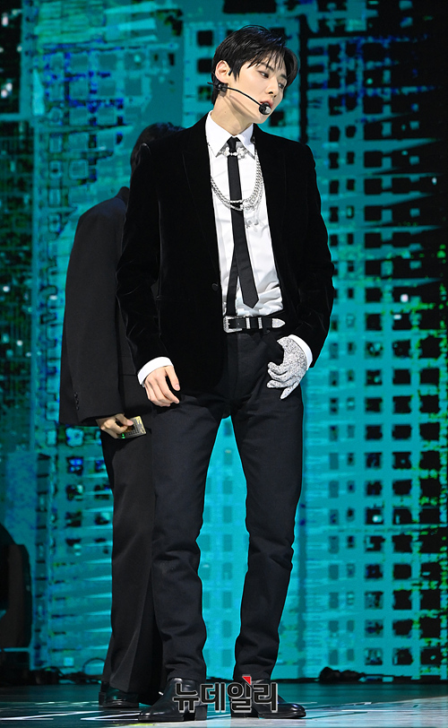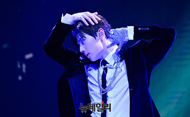 그룹 뉴이스트 멤버 황민현이 27일 오후 서울 광진구 예스24라이브홀에서 열린 솔로 미니 1집 'Truth or Lie(트루스 오어 라이)' 발매 기념 쇼케이스에서 무대를 선보이고 있다.