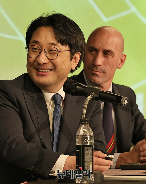 오병기 쓰리디팩토리 대표가 2일 오전 서울 종로구 포시즌호텔에서 루이스 루비알레스 스페인왕립축구연맹(RFEF) 회장을 초청해 파트너십 구축하는 업무협약을 갖고 기념촬영을 하고 있다.