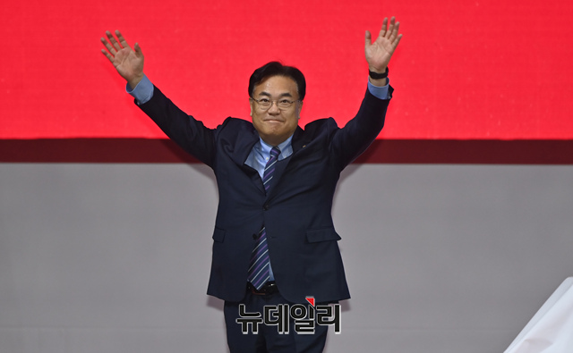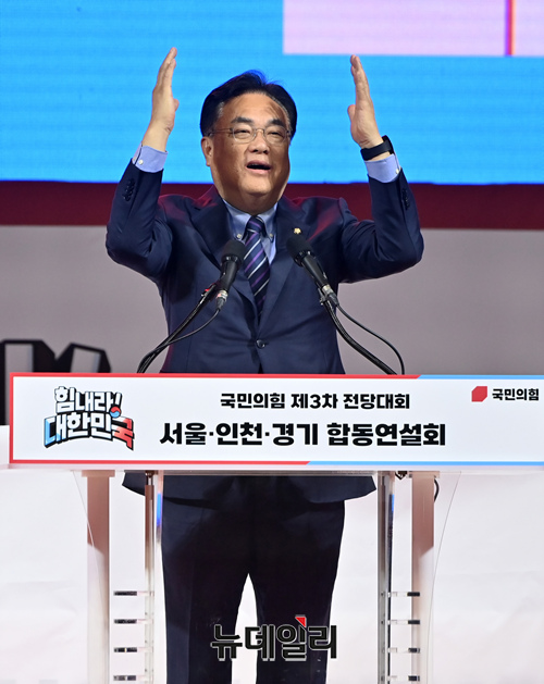 정진석 국민의힘 비상대책위원장이 2일 오후 경기 고양시 고양체육관에서 열린 제3차 전당대회 서울·인천·경기 합동연설회에서 인사말을 하고 있다. (경기 고양=서성진 기자)