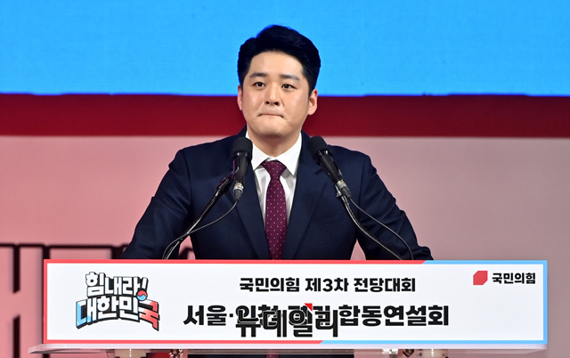 김정식 국민의힘 청년 최고위원 후보가 2일 오후 경기 고양시 고양체육관에서 열린 제3차 전당대회 서울·인천·경기 합동연설회에서 정견발표를 하고 있다. (경기 고양=서성진 기자)