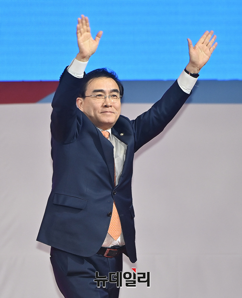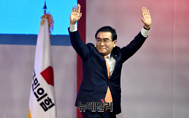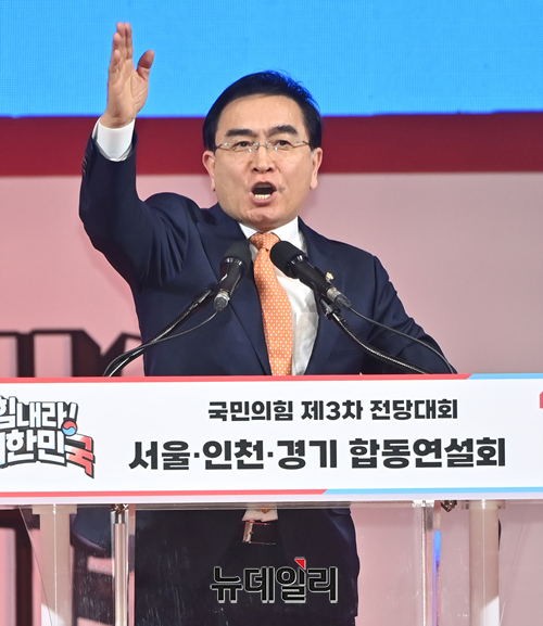 태영호 국민의힘 최고위원 후보가 2일 오후 경기 고양시 고양체육관에서 열린 제3차 전당대회 서울·인천·경기 합동연설회에서 정견발표를 하고 있다. (경기 고양=서성진 기자)