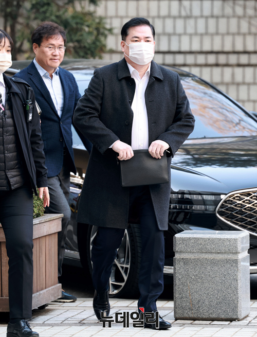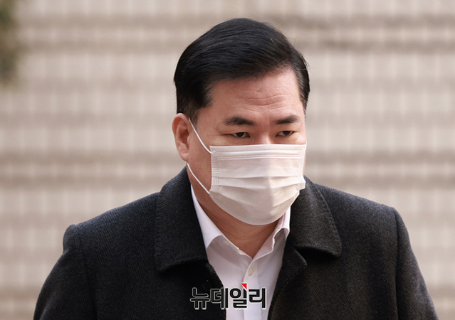 유동규 전 성남도시개발공사 본부장이 6일 오전 서울 서초구 중앙지방법원에서 열린 대장동 개발 사업 로비·특혜 의혹 관련 공판에 출석하고 있다.