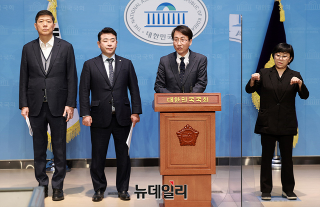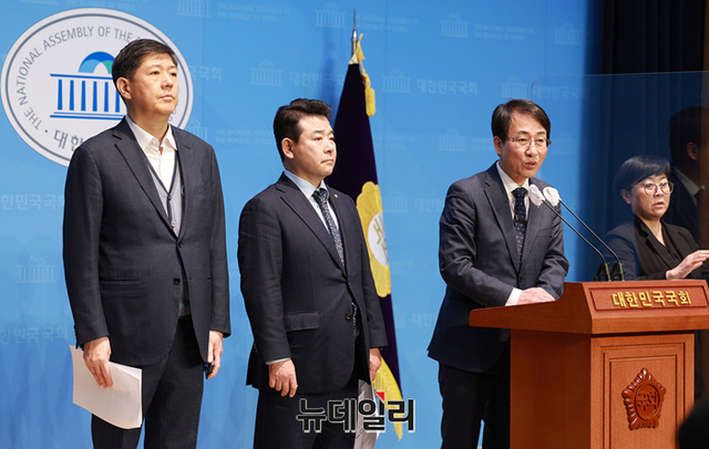 국회 외교통일위원회 위원인 더불어민주당 이원욱, 박정, 무소속 김홍걸 의원이 6일 오후 국회 소통관에서 강제동원 배상안과 관련 기자회견을 갖고 있다.