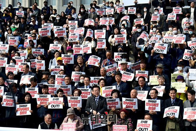 이재명 더불어민주당 대표가 7일 오후 국회 본청 앞 계단에서 열린 '굴욕적인 강제동원 정부해법 강행 규탄! 일본의 사죄배상 촉구! 긴급 시국선언'에서 발언하고 있다.