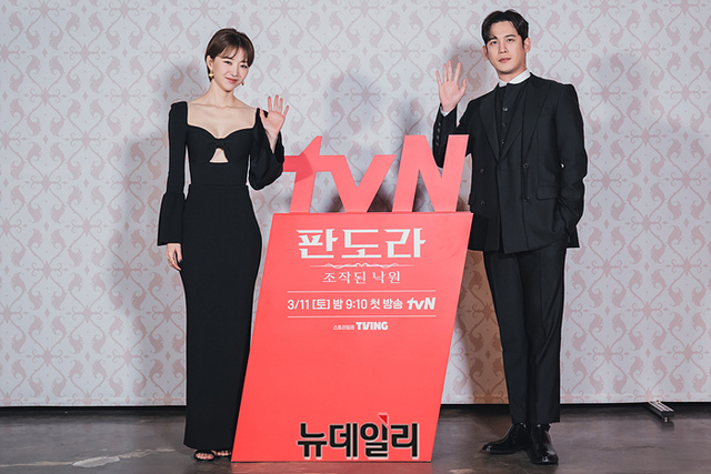 배우 장희진, 박기웅이 7일 오후 온라인으로 열린 tvN 드라마 '판도라 : 조작된 낙원(연출 최영훈)' 제작보고회에서 포즈를 취하고 있다.