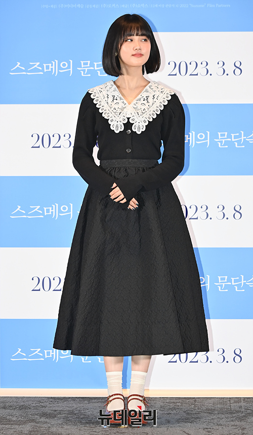하라 나노카(스즈메 역)가 8일 오전 서울 성동구 메가박스 성수점에서 열린 영화 '스즈메의 문단속' 기자간담회에서 포토타임을 갖고있다.
