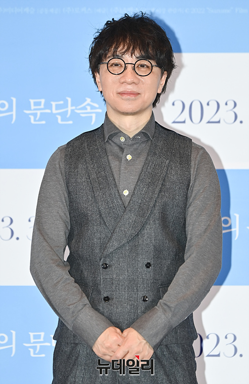 신카이 마코토 감독이 8일 오전 서울 성동구 메가박스 성수점에서 열린 영화 '스즈메의 문단속' 기자간담회에서 포토타임을 갖고있다.