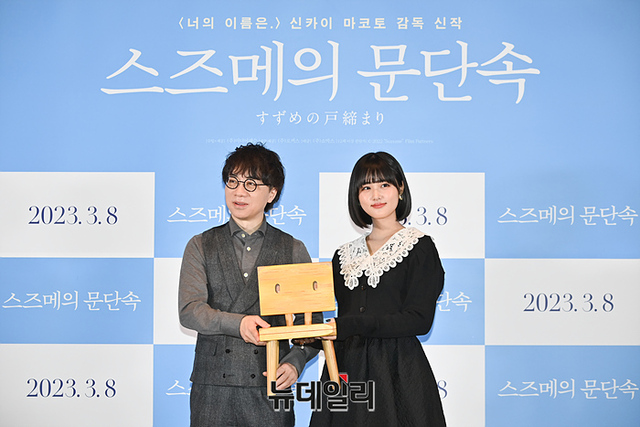 하라 나노카(스즈메역)와 신카이마코토 감독이 8일 오전 서울 성동구 메가박스 성수점에서 열린 영화 '스즈메의 문단속' 기자간담회에서 소품(의자로 변한 소타)을 들고 포토타임을 갖고있다.