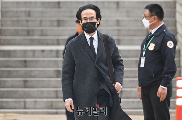 조현범 한국타이어 회장이 8일 오후 서울 서초구 중앙지방법원으로 영장실질심사를 받기 위해 출석하고 있다.