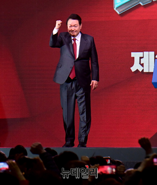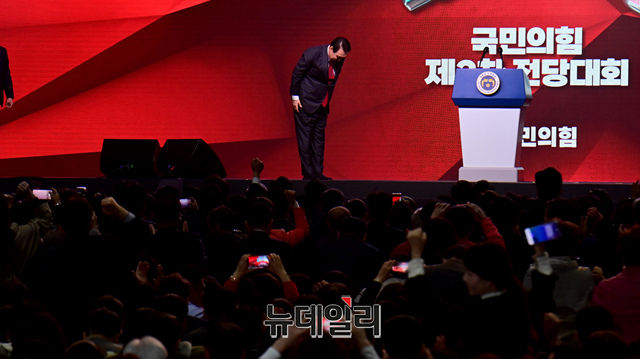 윤석열 대통령이 8일 오후 경기도 고양시 일산서구 킨텍스에서 열린 국민의힘 제3차 전당대회에서 축사를 마치고 떠나고 있다. (경기 고양=이종현 기자)