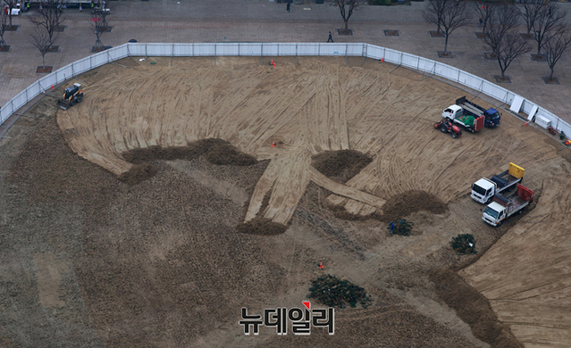 서울시청 앞 서울광장이 9일 오전 잔디 식재와 녹지대 조성작업을 하고 있다. 서울시는 서울광장에 녹지대 조성과 소나무, 초화류 등을 심을 예정이다.