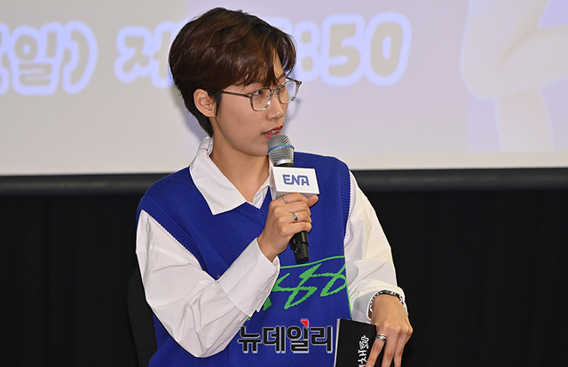 크리에이터 재재가 9일 오전 서울 마포구 스탠포드 호텔에서 열린 ENA 예능 '혜미리예채파' 제작발표회에서 사회를 보고 있다..