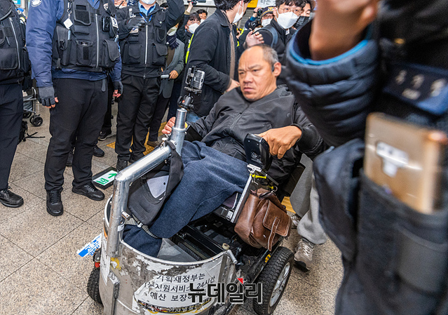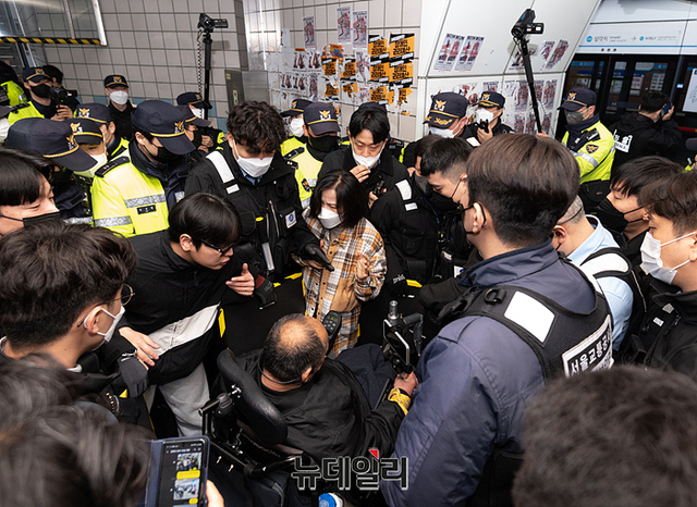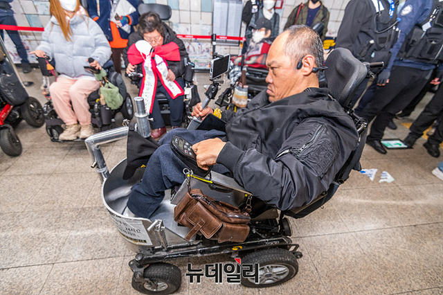 전국장애인차별철폐연대(전장연)이 9일 오전 서울 지하철 4호선 삼각지역에서 개조된 전동휠체어를 타고 경찰과 대치하고 있다.