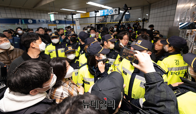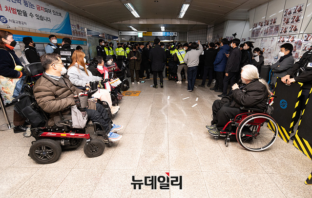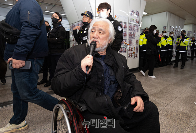 박경석 전국장애인차별쳘폐연대(전장연) 대표가 9일 오전 서울 지하철 4호선 삼각지역에서 열린 기자회견에서 발언하고 있다.
