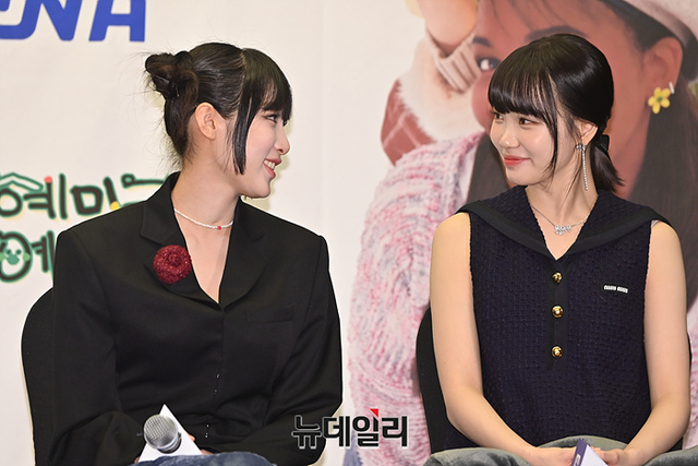가수 최예나와 르세라핌 김채원이 9일 오전 서울 마포구 스탠포드 호텔에서 열린 ENA 예능 '혜미리예채파' 제작발표회에서 인터뷰를 하고 있다.