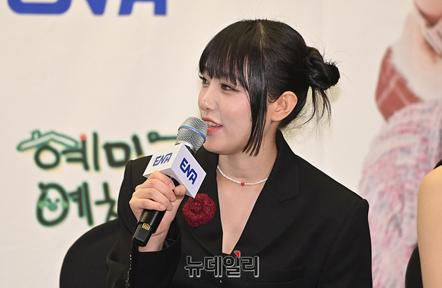 가수 최예나가 9일 오전 서울 마포구 스탠포드 호텔에서 열린 ENA 예능 '혜미리예채파' 제작발표회에서 인터뷰를 하고 있다.