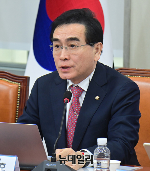 태영호 국민의힘 최고위원이 9일 오전 국회에서 열린 최고위원회에서 모두발언을 하고 있다.