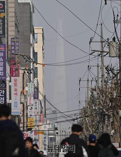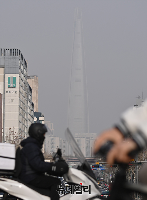 수도권 미세먼지가 '나쁨' 단계인 9일 오전 서울 송파구 롯데월드타워가 미세먼지로 뿌옇게 보이고 있다.