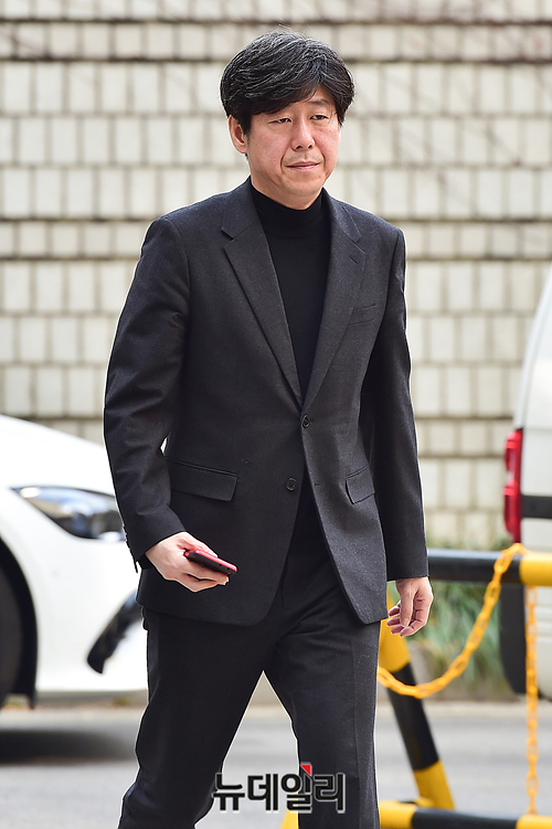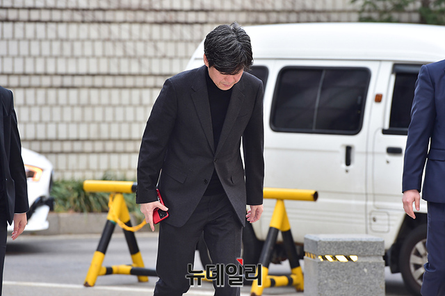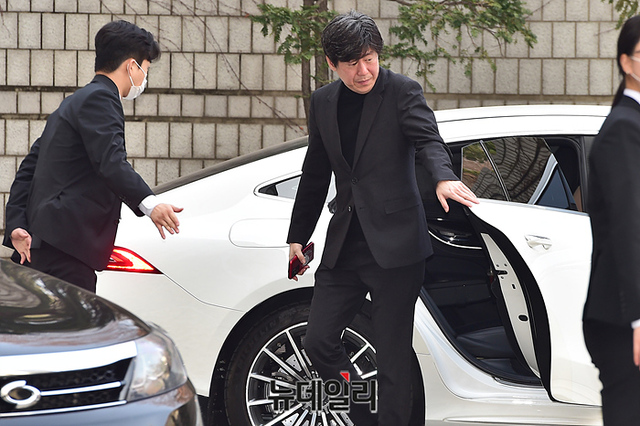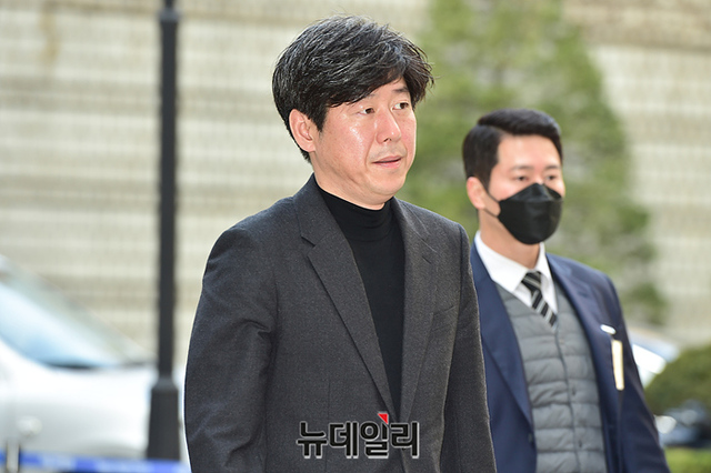 남욱 변호사가 10일 오전 서울 서초구 중앙지법에서 열린 김용 전 민주연구원 부원장의 불법 정치자금·뇌물 수수 관련 공판에 출석하고 있다.