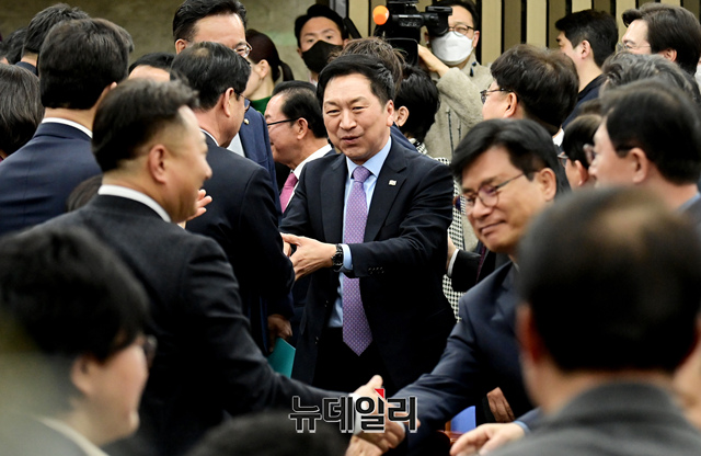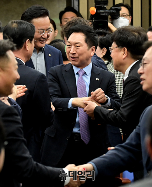 [포토] 의원들과 인사 나누는 김기현 국민의힘 대표