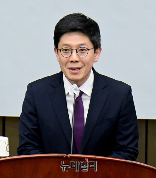 김병민 국민의힘 최고위원이 10일 오전 국회에서 열린 정책의원총회에 참석해 모두발언을 하고 있다.