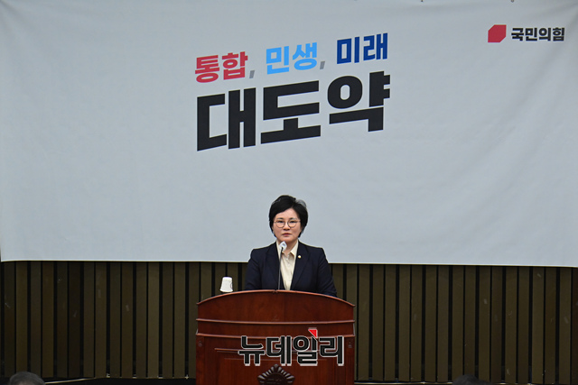 조수진 국민의힘 최고위원이 10일 오전 국회에서 열린 정책의원총회에 참석해 모두발언을 하고 있다.
