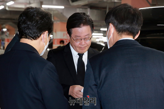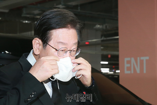 이재명 더불어민주당 대표가 10일 오후 경기 성남시의료원 장례식장에 마련된 경기지사 시절 초대 비서실장 전 모씨의 빈소에 들어서며 마스크를 착용하고 있다. (경기 성남=정상윤 기자)