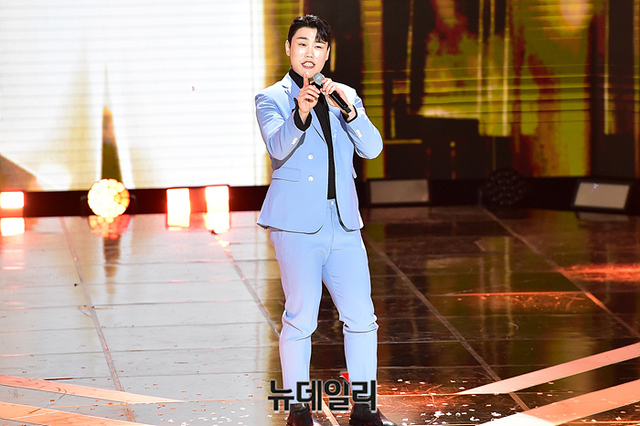 가수 고정우가 13일 오후 서울 마포구 SBS 프리즘타워에서 열린 '더 트롯쇼' 생방송 미디어 현장 공개에서 '고장난 벽시계 (원곡자 : 나훈아)' 무대를 선보이고 있다.
