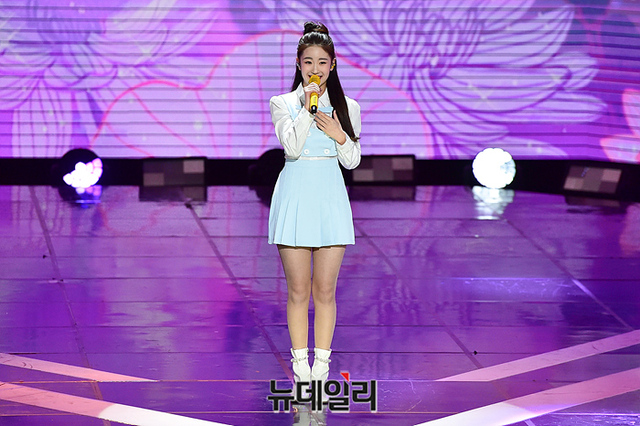 가수 오유진이 13일 오후 서울 마포구 SBS 프리즘타워에서 열린 '더 트롯쇼' 생방송 미디어 현장 공개에서 '사랑꽃' 무대를 선보이고 있다.