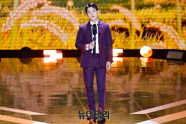 가수 박군이 13일 오후 서울 마포구 SBS 프리즘타워에서 열린 '더 트롯쇼' 생방송 미디어 현장 공개에서 '아침밥상' 무대를 선보이고 있다.