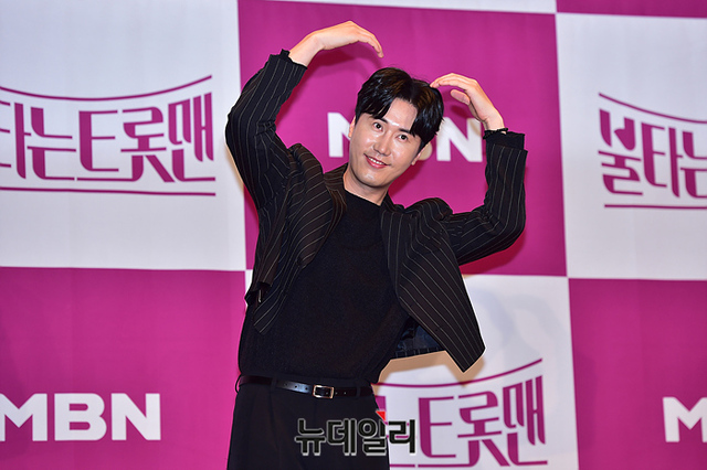 가수 신성이 14일 오후 서울 마포구 누리꿈스퀘어 비즈니스타워에서 열린 MBN 예능 '불타는 트롯맨' 기자간담회에서 포즈를 취하고 있다.