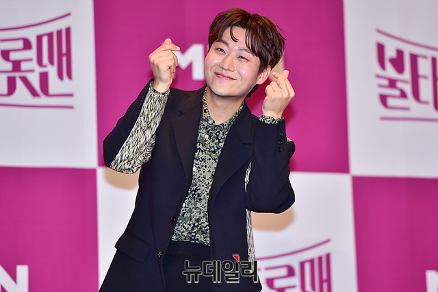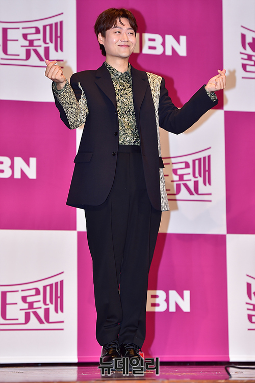 가수 민수현이 14일 오후 서울 마포구 누리꿈스퀘어 비즈니스타워에서 열린 MBN 예능 '불타는 트롯맨' 기자간담회에서 포즈를 취하고 있다.
