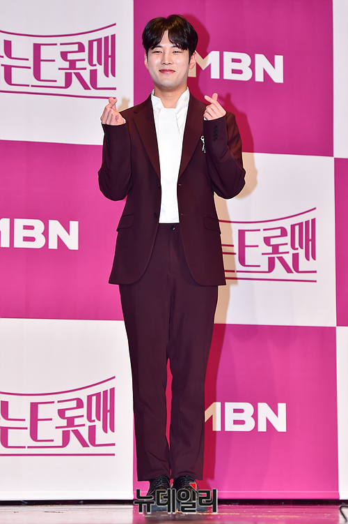 가수 김중연이 14일 오후 서울 마포구 누리꿈스퀘어 비즈니스타워에서 열린 MBN 예능 '불타는 트롯맨' 기자간담회에서 포즈를 취하고 있다.