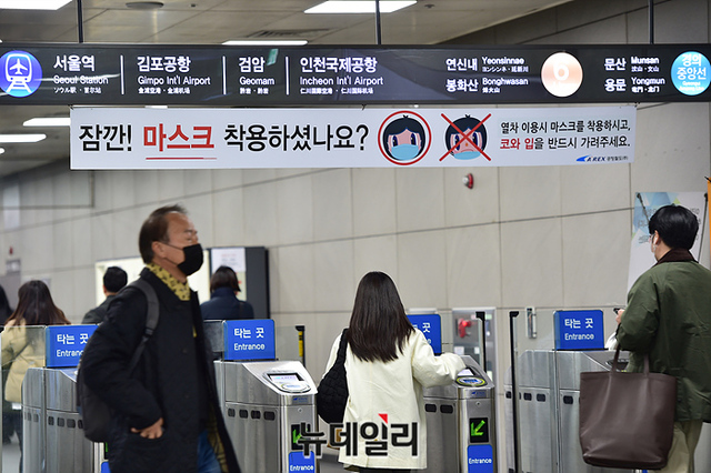 대중교통 마스크 착용 의무가 시행중인 14일 오후 서울도심의 지하철역에서 마스크를 착용한 시민들이 이동하고 있다. 정부는 내일 감염취약시설, 대중교통 등의 해제시점을 발표할 예정이다.