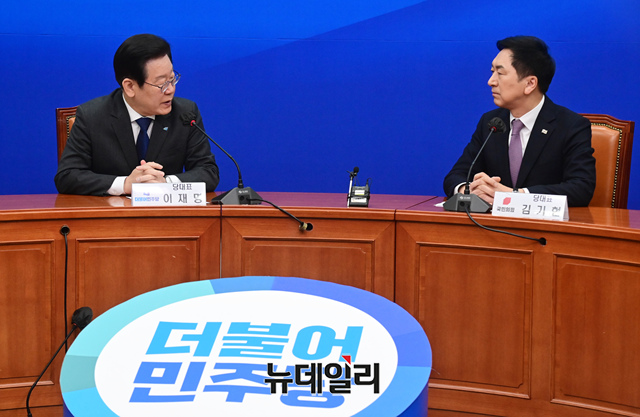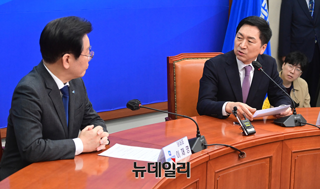 김기현 국민의힘 대표와 이재명 더불어민주당 대표가 15일 오전 국회에서 회동을 갖고 환담을 나누고 있다.