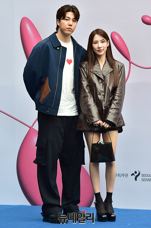 환승연애2 출연자 희두, 나연이 15일 오후 서울 동대문디자인플라자에서 열린 '2023 F/W 서울패션위크(Seoul Fashion Week)'에 참석해 포즈를 취하고 있다.