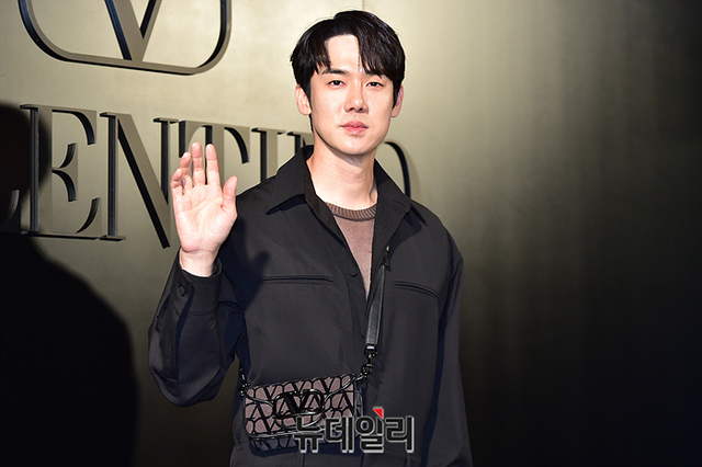배우 유연석이 15일 오후 서울 종로구 루프스테이션 익선에서 열린 '2023년 봄/여름 컬렉션, 언박싱 발렌티노' 프레젠테이션 행사에서 포즈를 취하고 있다.