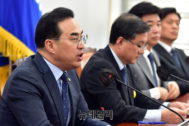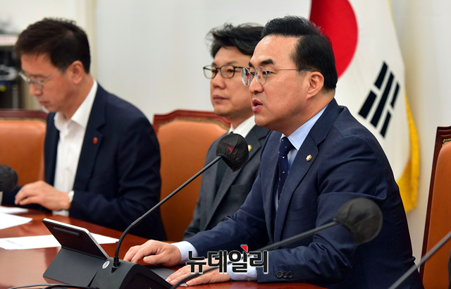 박홍근 더불어민주당 원내대표가 16일 오전 국회에서 열린 정책조정회의에 참석해 발언을 하고 있다.