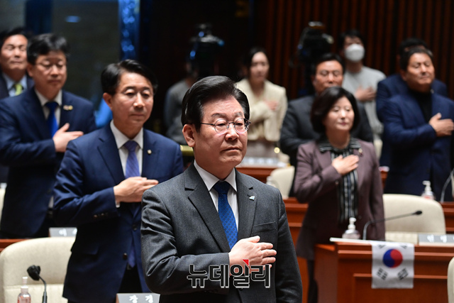 이재명 더불어민주당 대표와 박홍근 원내대표가 16일 국회에서 열린 의원총회에 참석해 국민의례를 하고있다.