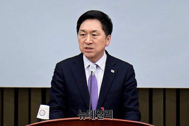 김기현 국민의힘 대표가 16일 오후 국회에서 열린 정책의원총회에 참석해 모두발언을 하고 있다.