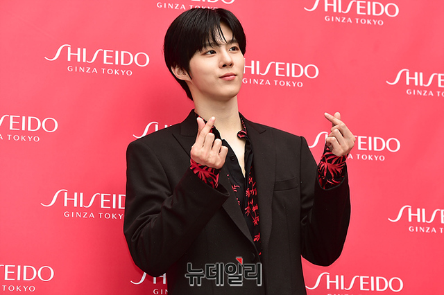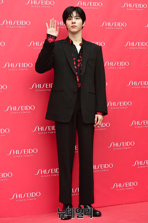 가수 김우석이 16일 오후 서울 성동구의 한 카페에서 열린 '시세이도 레드 사이클 팝업스토어' 행사에서 포즈를 취하고 있다.