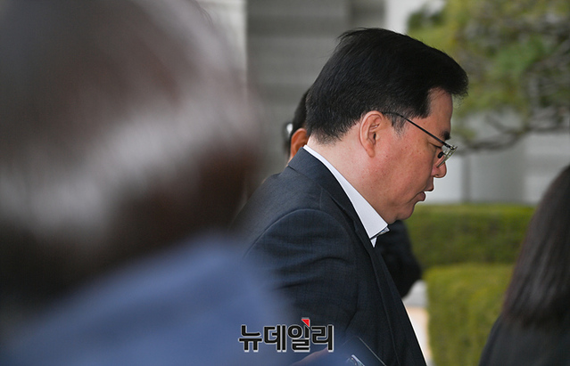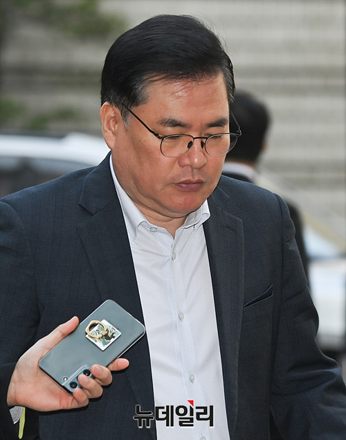 유동규 전 성남도시개발공사 본부장이 20일 오전 서울 서초구 중앙지방법원에서 열린 특정범죄가중처벌등에관한법률위반 공판에 출석하고 있다.