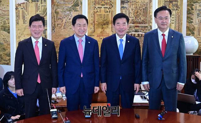 [포토] 기념촬영 하는 김진표 의장과 김기현 대표