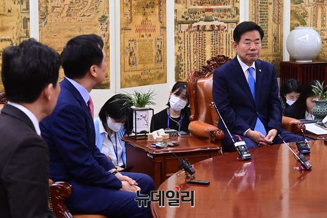 김진표 국회의장이 20일 오전 국회 의장실을 예방한 김기현 국민의힘 대표 환담을 나누고 있다.