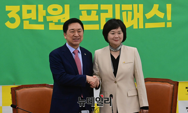 김기현 국민의힘 대표와 이정미 정의당 대표가 20일 오전 국회 정의당 대표실에서 기념촬영을 하고 있다.