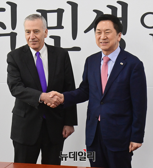 김기현 국민의힘 대표가 20일 오후 국회를 방문한 필립 골드버그 주한미국대사와 기념촬영을 하고 있다.