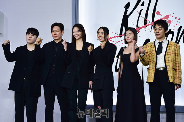 감독 변성현(왼쪽부터), 배우 설경구, 이솜, 전도연, 김시아, 구교환이 21일 오전 서울 강남구 그랜드 인터컨티넨탈 파르나스 서울에서 열린 넷플릭스 영화 '길복순' 제작보고회에서 포즈를 취하고 있다.